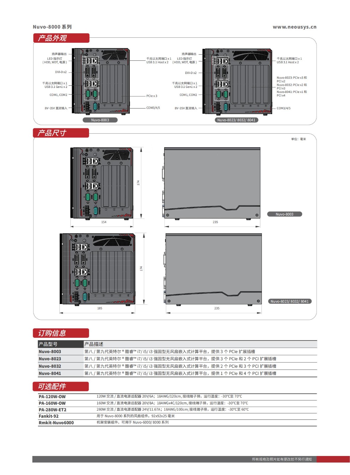 Nuvo-8000系列是具有高性价比的无风扇嵌入式智能系统,最多可支持5个扩展槽,可替代您原先笨重的壁挂式或机架式安装工控机。Nuvo-8000配备了搭载H310芯片组的第八/第九代英特尔®酷睿™台式机处理器,能提供与传统工控机相同的算力,而其机箱尺寸却比传统工控机紧凑很多,价格也便宜很多。 Nuvo-8000系列下拥有4个产品型号,分别对应了不同的扩展配置。不论是紧凑的3个PCIe扩展槽,还是5个扩展槽(配最多3个PCIe扩展槽或最多4个PCI扩展槽),用户都可以根据自己的需求选择适合其工业自动化或机器视觉应用的工控机。Nuvo-8000前面板I/O端口包括,2个千兆以太网口,4个USB 3.1 Gen1和5个串口,这种前面板出线设计使得机箱在壁挂安装或被安装在一个狭小的箱体内时,也能轻松访问接口。在存储方面,Nuvo-8000系列拥有2个2.5” SATA SSD/ HDD和1个mSATA插槽,可支持各种存储设备。Nuvo-8000还可支持1个125W NVIDIA® GPU,为深度学习应用提供TFLOPS算力。 Nuvo-8000系列是专为满足工业应用需求而设计。Nuvo-8000系列保留了传统工控机的扩展功能,并以超紧凑的外形和工业级可靠性满足各种应用需求。