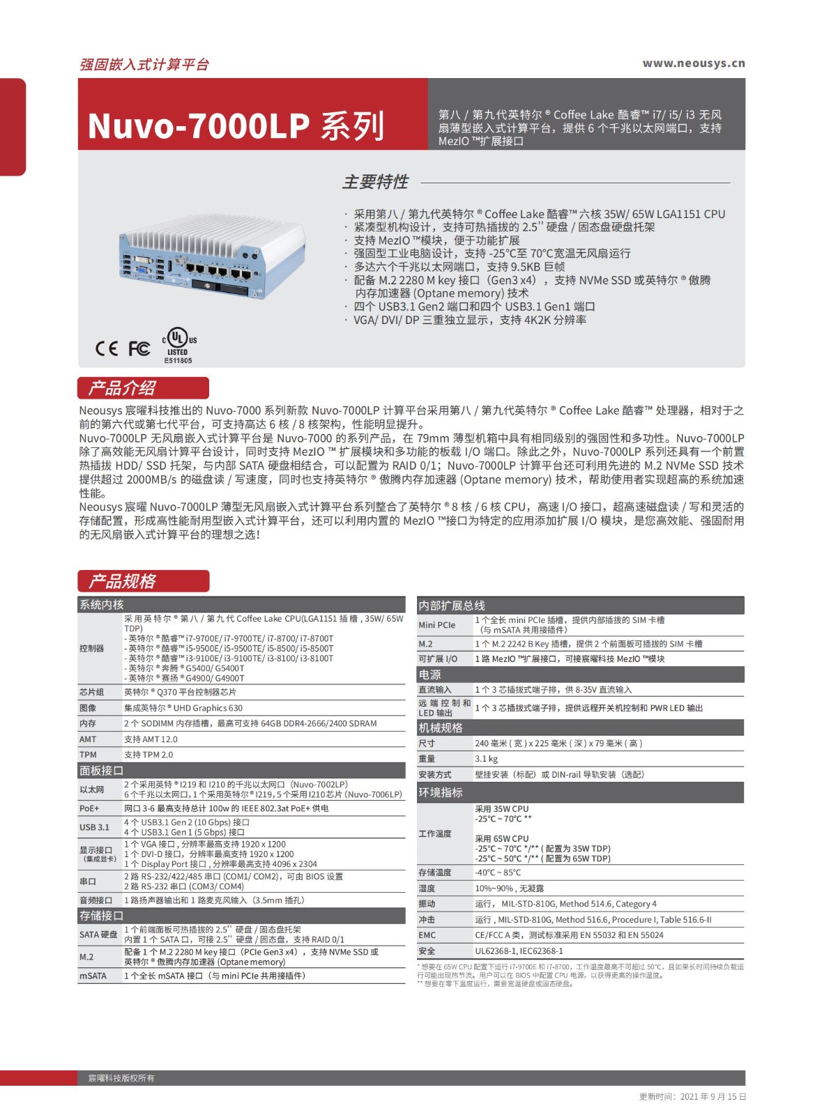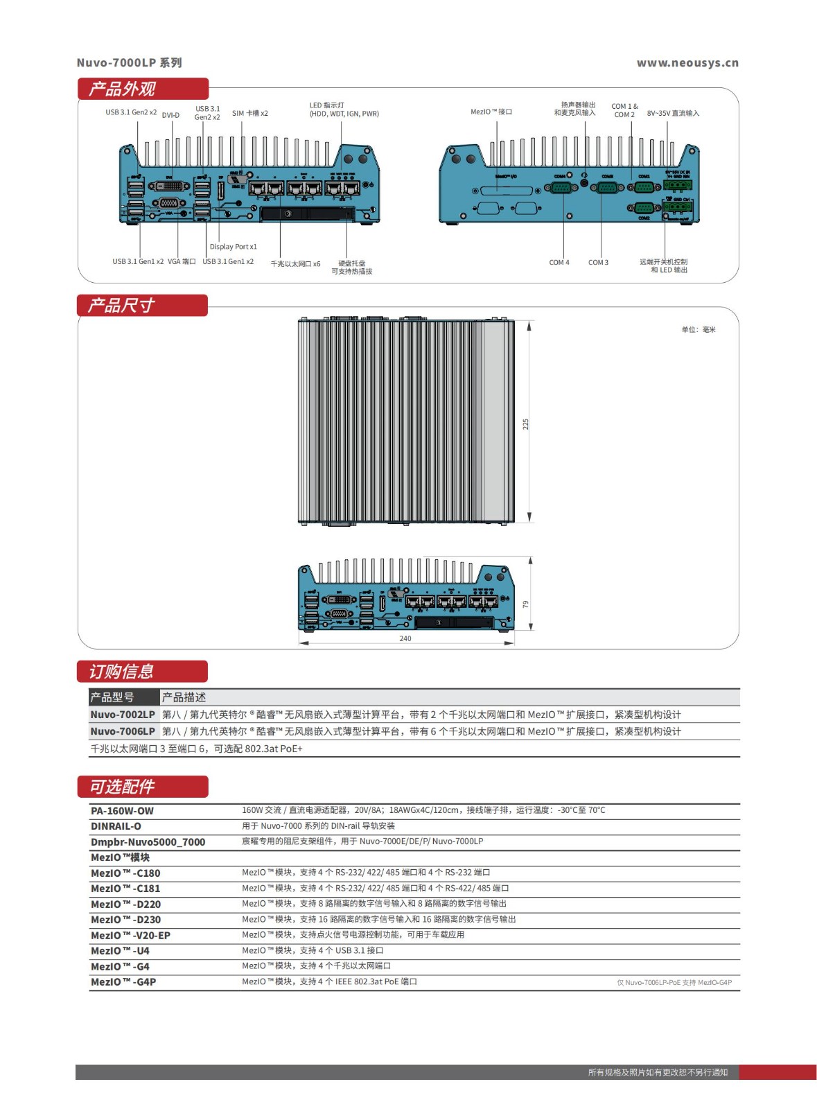 Neousys宸曜科技推出 2018年旗舰级强固型无风扇嵌入式工控机 Nuvo-7000系列,新款 Nuvo-7000LP工控机采用第九代/第八代 Intel英特尔® Coffee Lake酷睿™ i处理器,相对于之前的第六代或第七代平台,可支持高达八核/六核架构。 Nuvo-7000LP无风扇嵌入式工控机是 Nuvo-7000的系列产品,在 79mm薄型机箱中具有相同级别的强固性和多功性。Nuvo-7000LP除了高效能无风扇工控机设计,同时支持MezIO™扩展模块和多功能的板载 I/O端口。除此之外,Nuvo-7000LP系列还具有一个前置热插拔 HDD/SSD托架,可在组合时配置为 RAID 0/1 与内部 SATA端口;Nuvo-7000LP工控机还可利用先进的 M.2 NVMe SSD技术提供超过 2000MB/s的磁盘读/写速度,同时也支援英特尔® Optane™快取技术,帮助使用者实现出色的系统加速性能。 Neousys宸曜 Nuvo-7000LP薄型无风扇嵌入式工控机系列整合了英特尔八核处理器,高速 I/O 接口,超高速磁盘读/写和灵活的存储配置,形成高性能强固型嵌入式工控机,还可以利用内置的 MezIO™接口为扩展模块添加特定于应用程序的 I/O,是您高效能,强固耐用的无风扇嵌入式工控机理想之选!