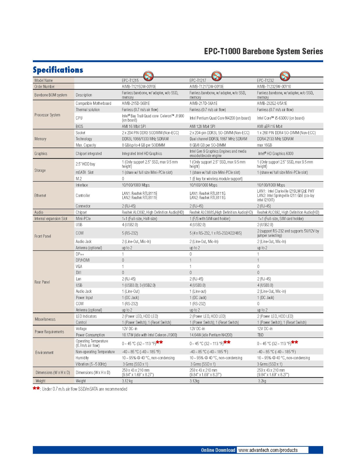 EPC-T1232是一款1U高度的嵌入式工控机,尺寸为250x210x43mm。板载Intel 第6代 Core™ I ULT CPU。采用12V DC-IN供电,无风扇超薄设计整机,适用于对空间尺寸有要求的行业。工业级品质,稳定可靠,支持上架,是理想的嵌入式工控机解决方案。