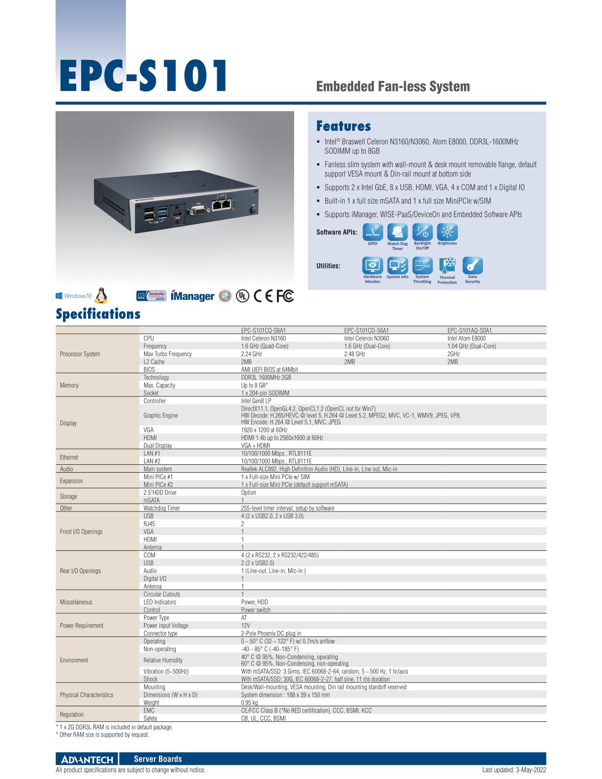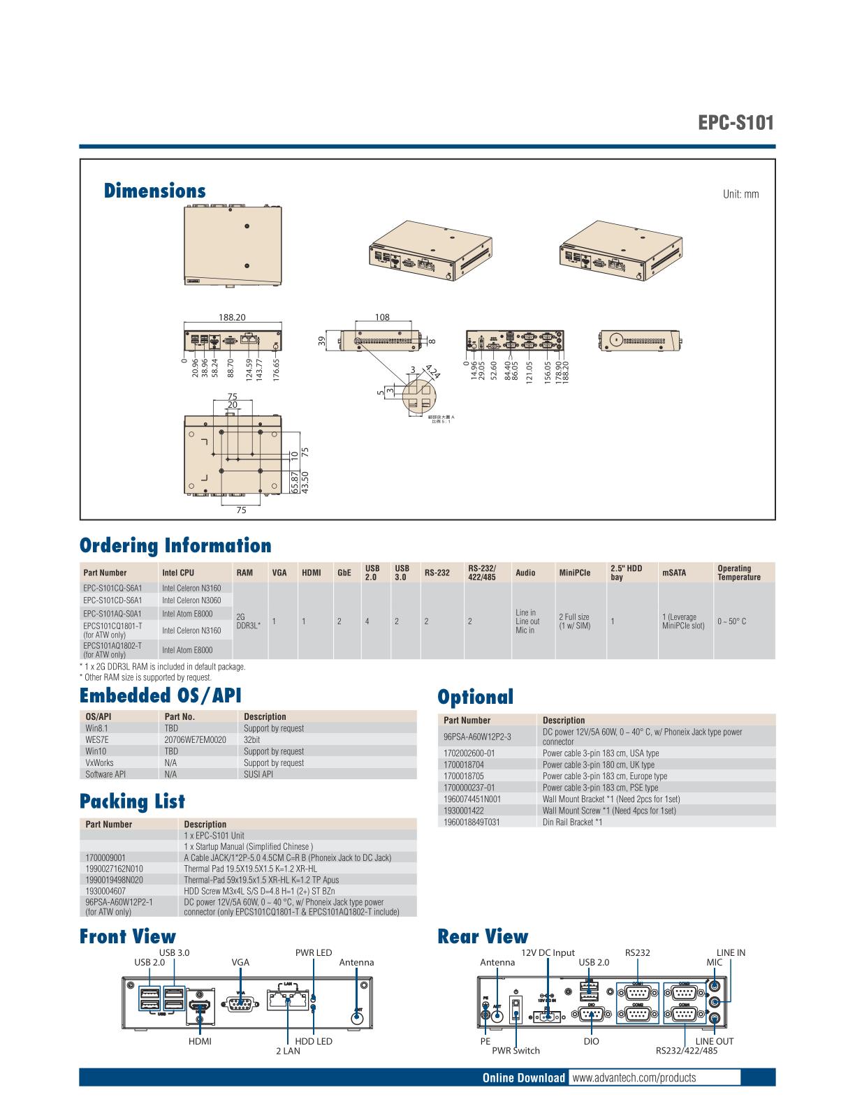 EPC-S101 嵌入式无风扇系统整机,掌上型尺寸,功耗低至6W,面板携带丰富接口,包括HDMI+VGA双显示,4COM,6USB3.0,2网口,1DIO,支持桌立式,墙贴式及导轨式安装,主要在工业自动化,HMI及物联网网关应用。