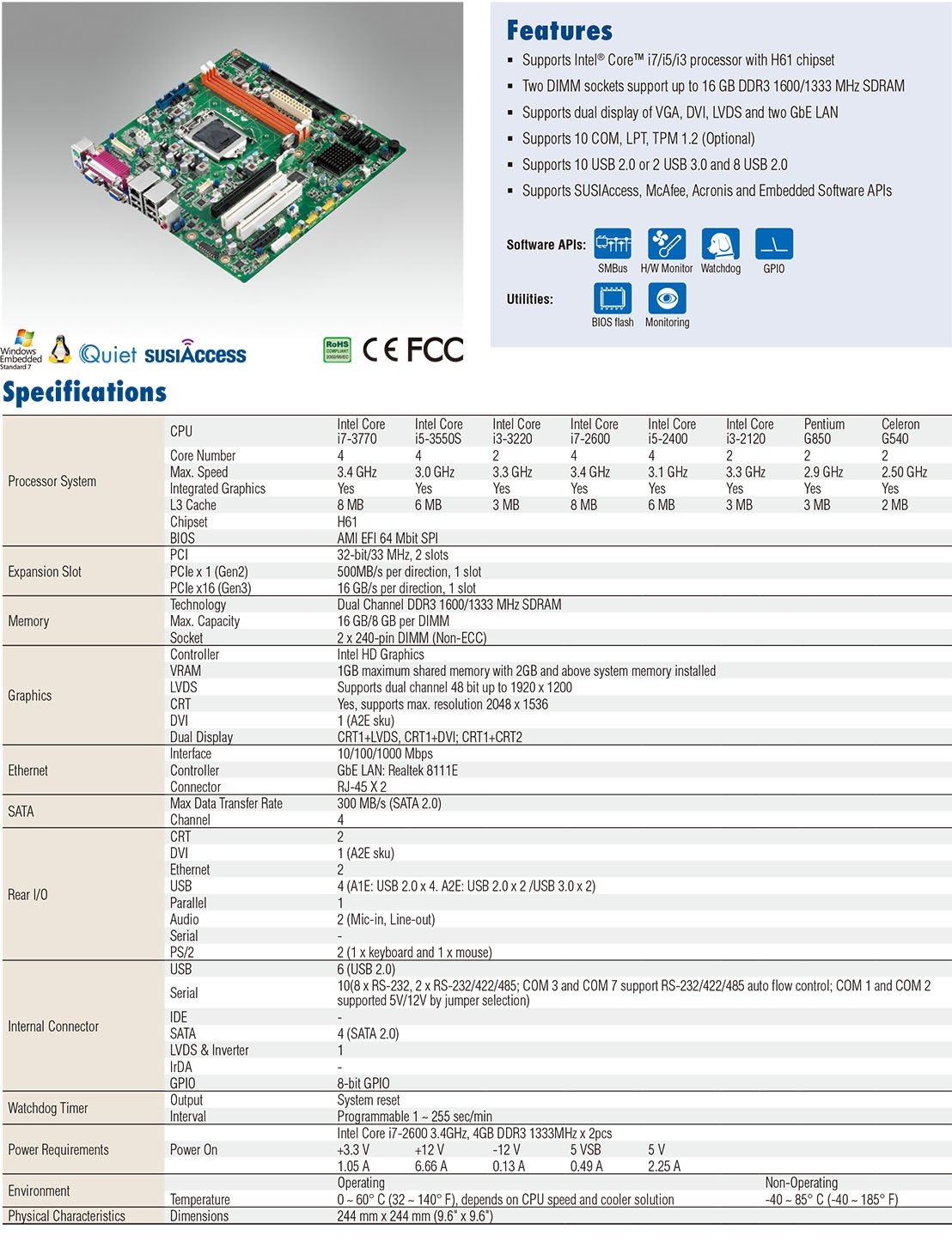 支持Intel Core i7/i5/i3,采用H61芯片组 双DIMM插槽,支持8GB DDR3 1066/1333MHz内存 支持VGA/DVI, LVDS独立双显输出,双千兆网口 支持10个COM输出接口,10个USB2.0接口,TPM1.2(可选) 支持SUSIAccess以及提供嵌入式软件API
