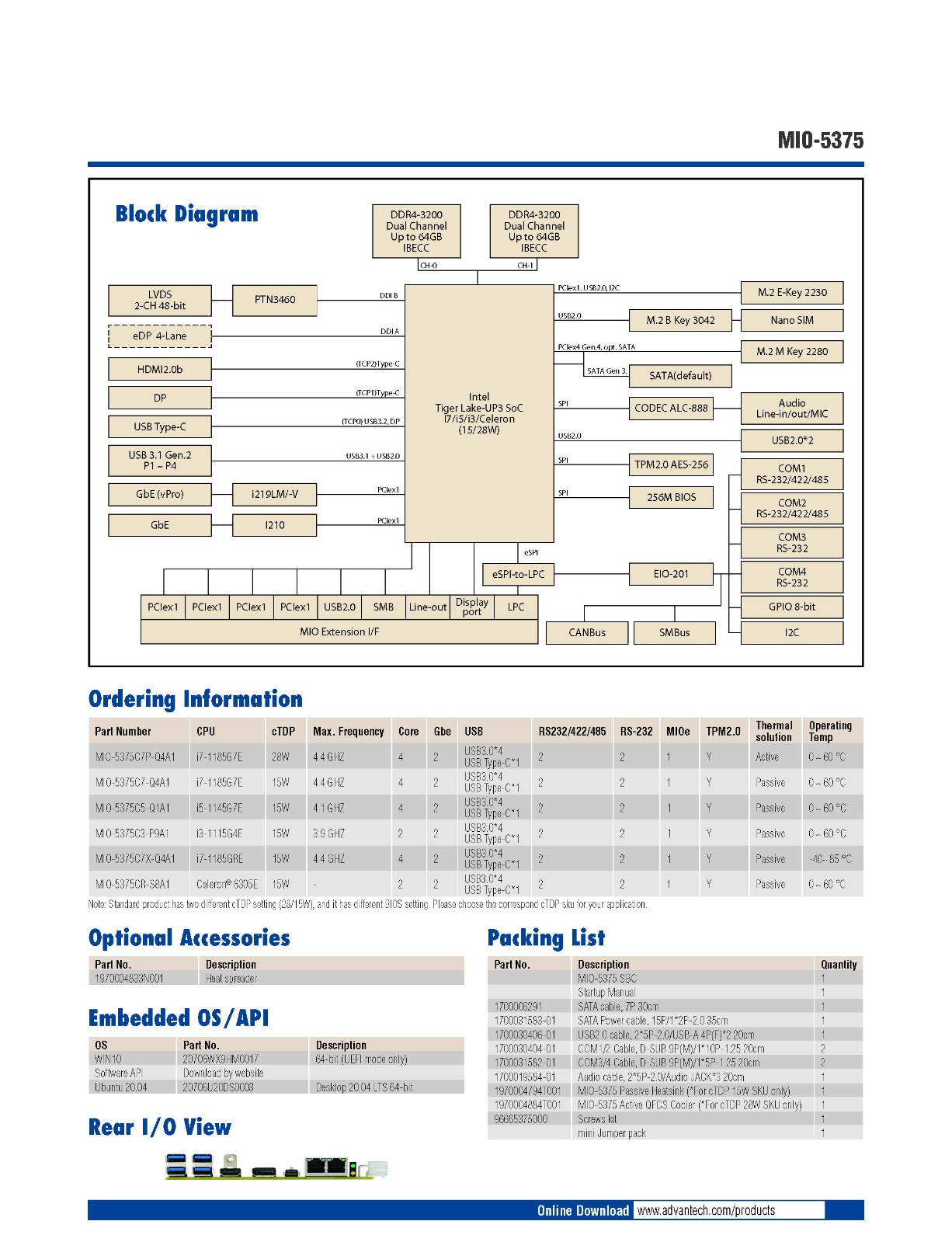 第11代 Intel®Core™四核/双核处理器,TDP 15W/ 28W 双通道DDR4-3200,高达64GB 独立四显:LVDS/ eDP*, HDMI, DP, USB Type-C 丰富I/O:2 GbE, 4 USB3.1, CAN Bus, DC-in 12-24V 扩展:M.2 E-Key/B-Key/M-Key(支持NVMe)、MIOe 支持 iManager、WISE-PaaS/RMM、SW API和Edge AI套件