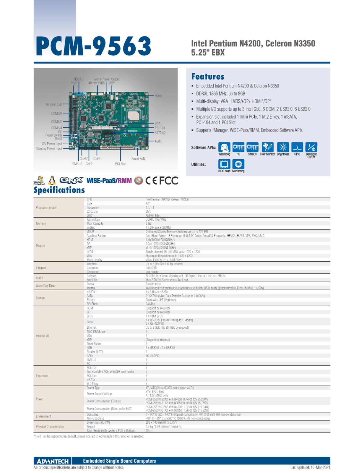 研华PCM-9563 搭载英特尔第六代Atom N4200/N3350系列CPU,带VGA / LVDS/HDMI独立三显示,支持3 GbE,8 USB,1 SATA,音频,1个miniPCIe,1 M.2 E kay,1 m.SATA,6个COM,广泛应用于军工,仪器仪表等行业。