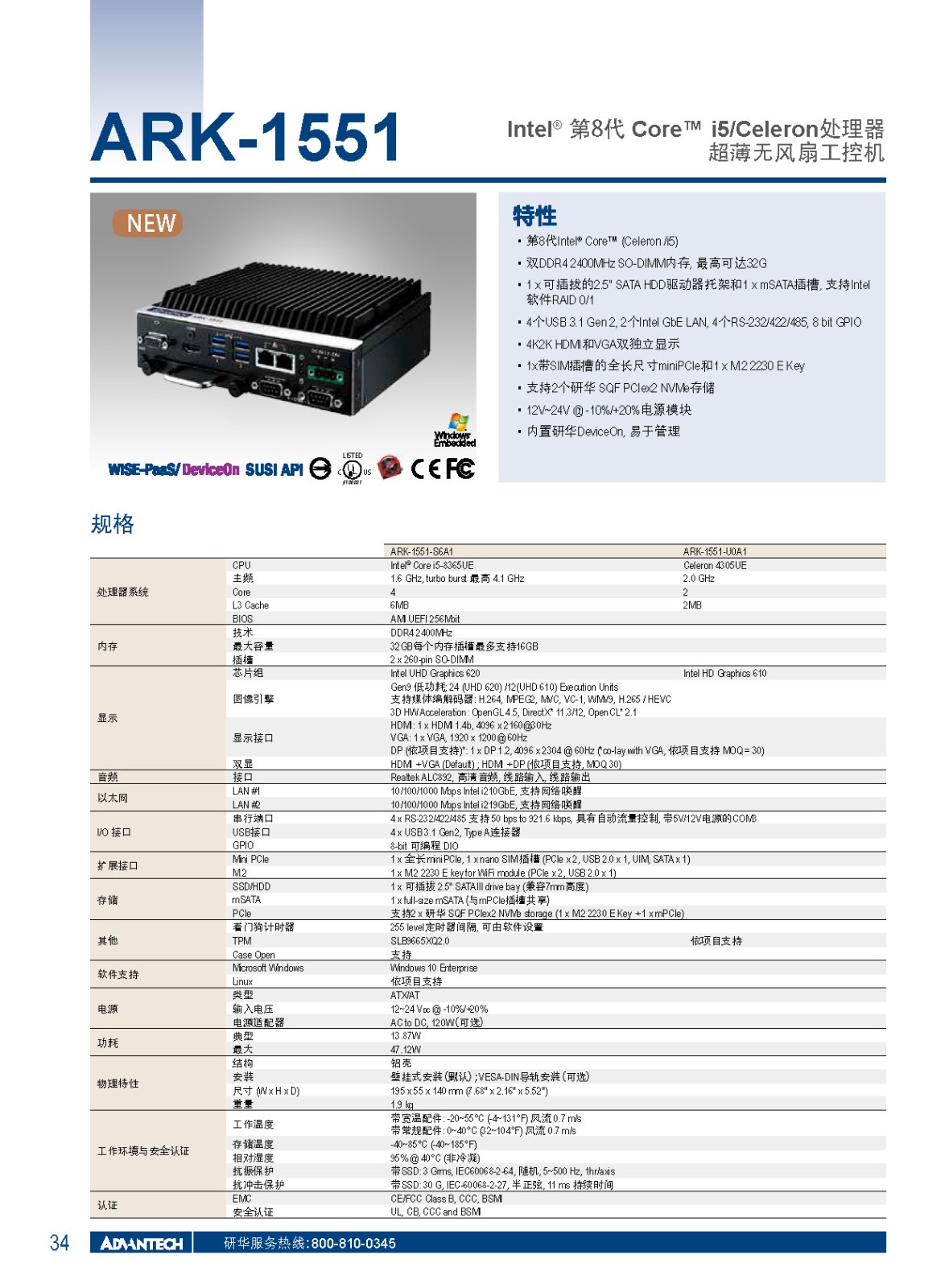 搭载Intel第8代 Core i5/Celeron处理器 双DDR4 2400MHz SO-DIMM内存,最高可达32G 1个可插拔的2.5" SATA硬盘托架和1个mSATA槽位,支持Intel软件RAID 0/1 4 × USB 3.1 Gen 2, 2 × Intel GbE LAN, 4 × RS-232/422/485, 8位GPIO 4K2K HDMI和VGA独立双显 1 x全尺寸mPCIe带SIM卡和1 x M.2 2230 E Key 支持研华SQF PCIex2 NVMe存储 12V - 24V @ -10%/+20%宽压输入 无RED认证