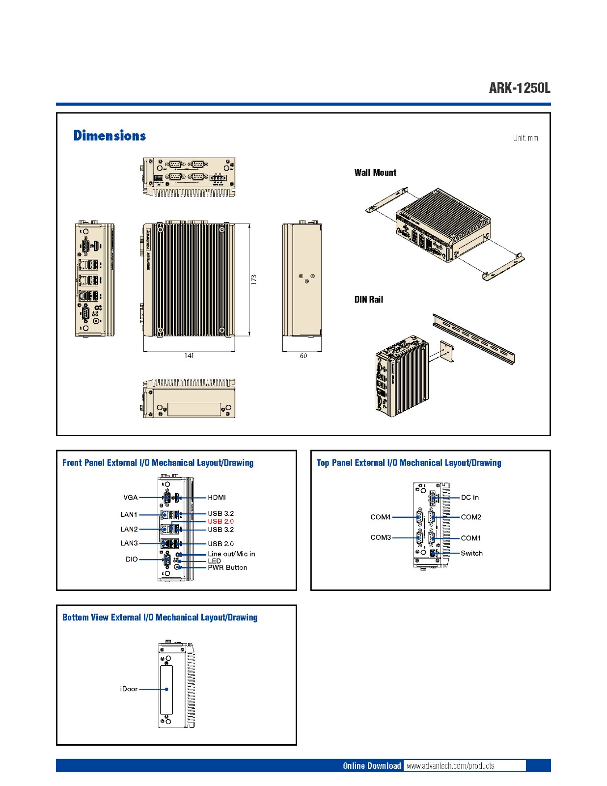 Intel 第11代 Core i5/i3 导轨式安装,在前面板I/O接口设计 3 x Intel GbE, 4 x RS-232/422/485, 8-bit DIO, 可选CANBus 3个扩展口: M.2 E-Key 2230, M.2 B-Key 2280, 1 x 全长尺寸 mSATA 与 mPCIe 共享 HDMI + VGA独立显示 mSATA 和1 x 2.5" SATA 存储 12V ~ 24V 输入电源 宽温设计:-40 ~ 60 °C 符合 Edge AI SRP of WISE-DeviceOn