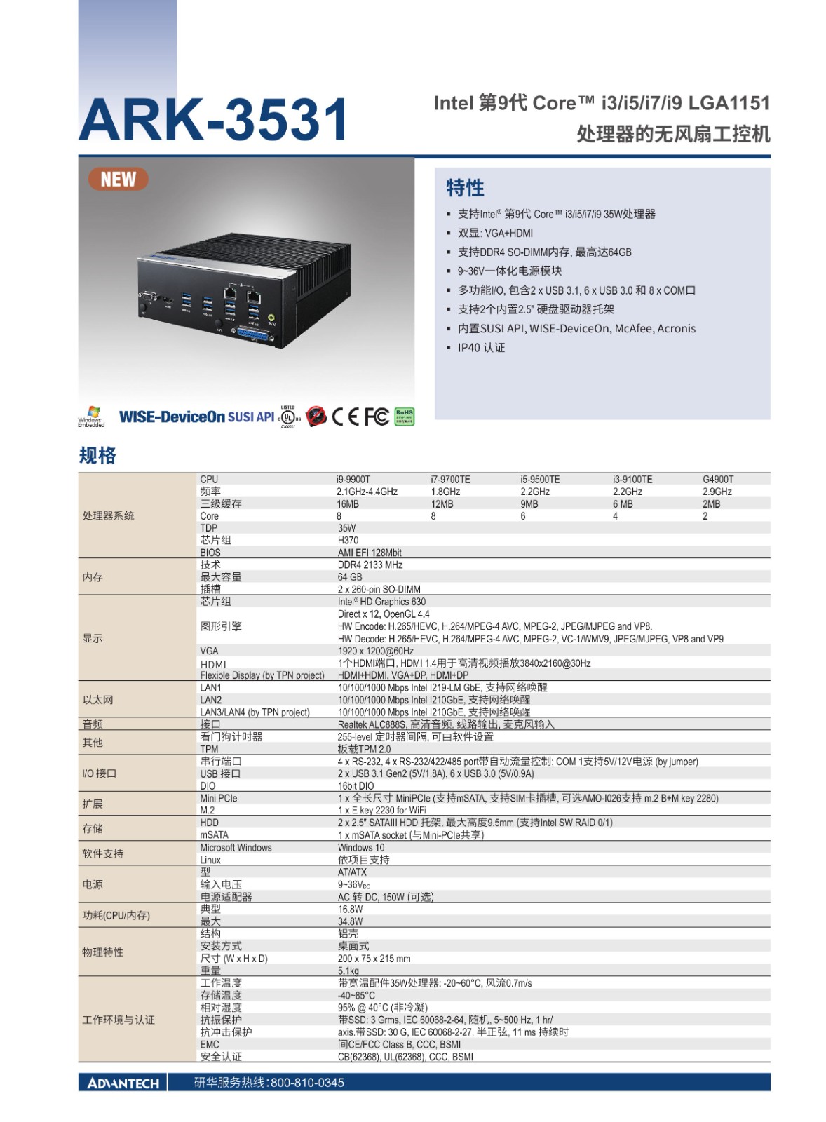 支持Intel第8和第9代Core i3/i5/i7/i9 35W处理器 双显示: VGA + HDMI DDR4 SO-DIMM内存支持,高达64GB 9-36VDC宽压输入 通用的 I/O接口,包括 2 x USB 3.1, 6 x USB 3.0 and 8 x COM接口 支持 2 内置2.5" 硬盘托架 (Intel SW RAID 0/1) 无 RED 认证