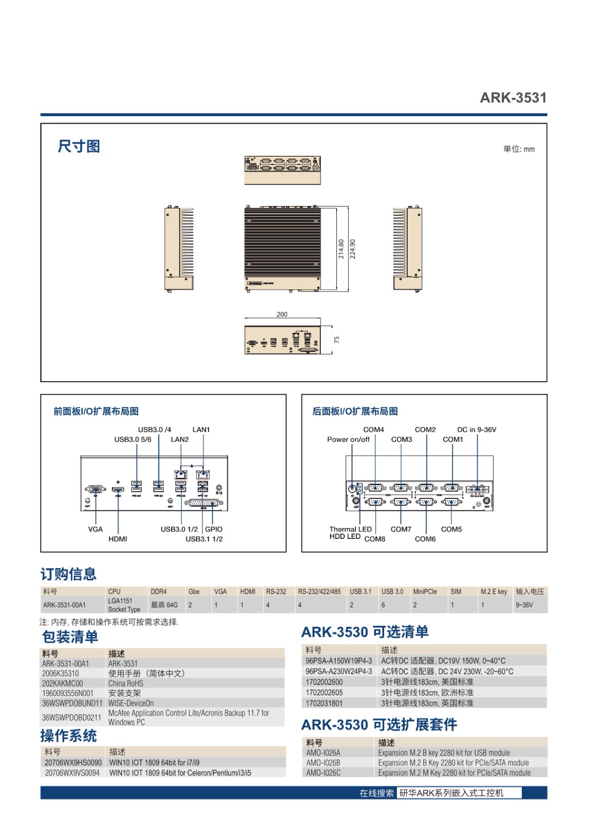 Intel OPS(开放可插拔规范)外形因素 瑞芯芯片RK3399 SOC(双核Cortex-A72 +四核Cortex-A53) LPDDR4-3200 4G + 64G eMMC 可通过m . 22230e密钥和miniPCIe插槽扩展 支持Android 7.1和Linux Debian 9 (Kernel 4.4) 易于安装和维护,采用Intel OPS插槽设计 无RED认证
