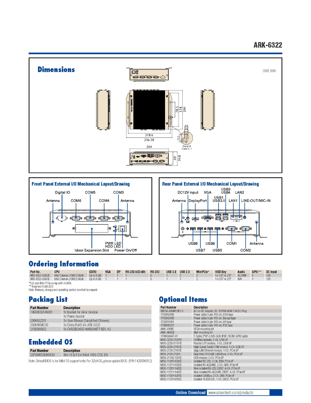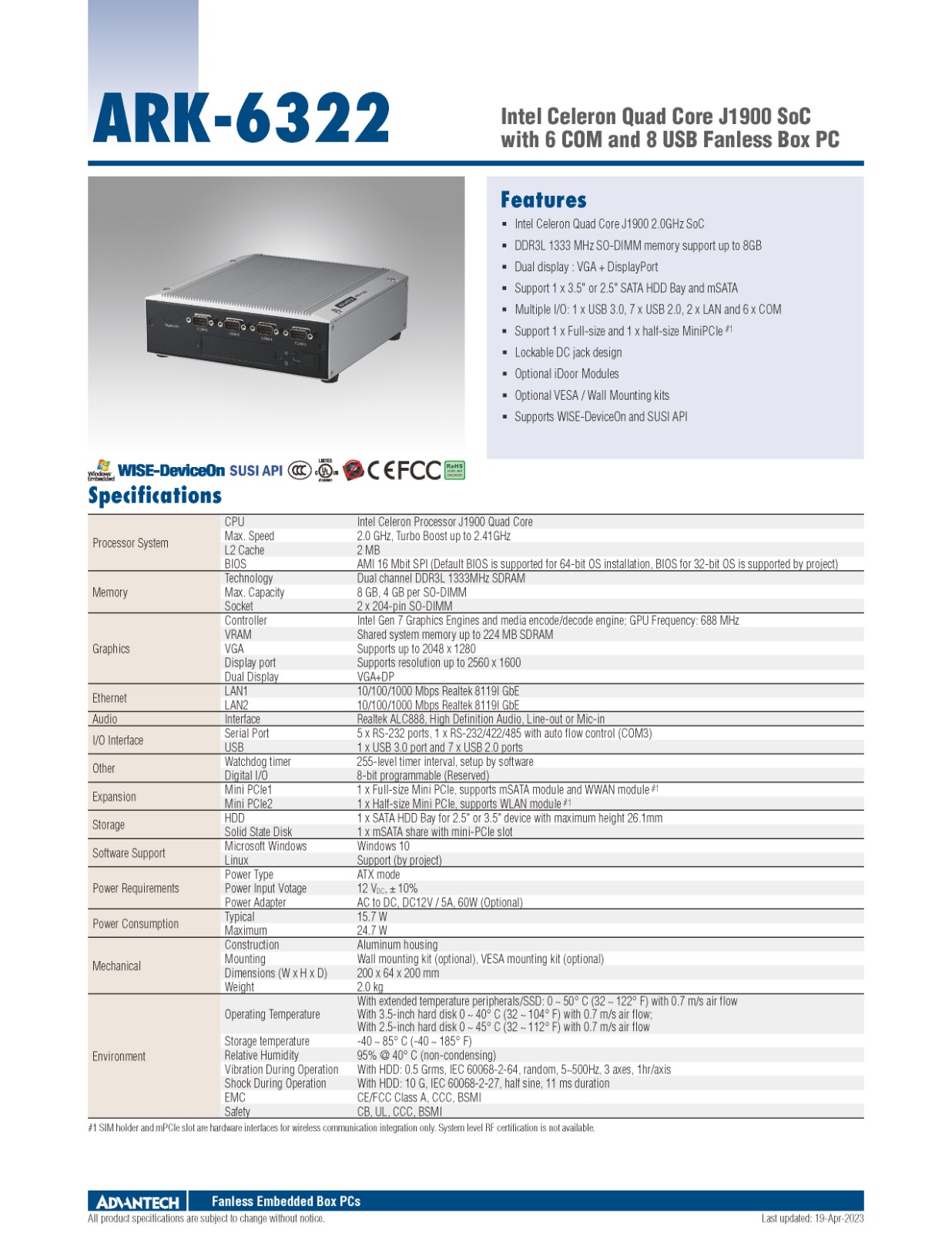 Intel Celeron 四核 Core J1900 2.0GHz 处理器 DDR3L 1333 MHz SO-DIMM 内存最高支持8GB 双显: VGA + DisplayPort 支持 1 x 3.5" 或 2.5 SATA HDD及mSATA 丰富I/O:1 x USB 3.0, 7 x USB 2.0,2 x LAN 及 6 x COM 支持 1 x 全长尺寸及1 x 半长尺寸MiniPCIe 锁固型DC jack 电源输入 可选VESA、壁挂式等安装方式 支持SUSIAccess及其他内嵌APIs