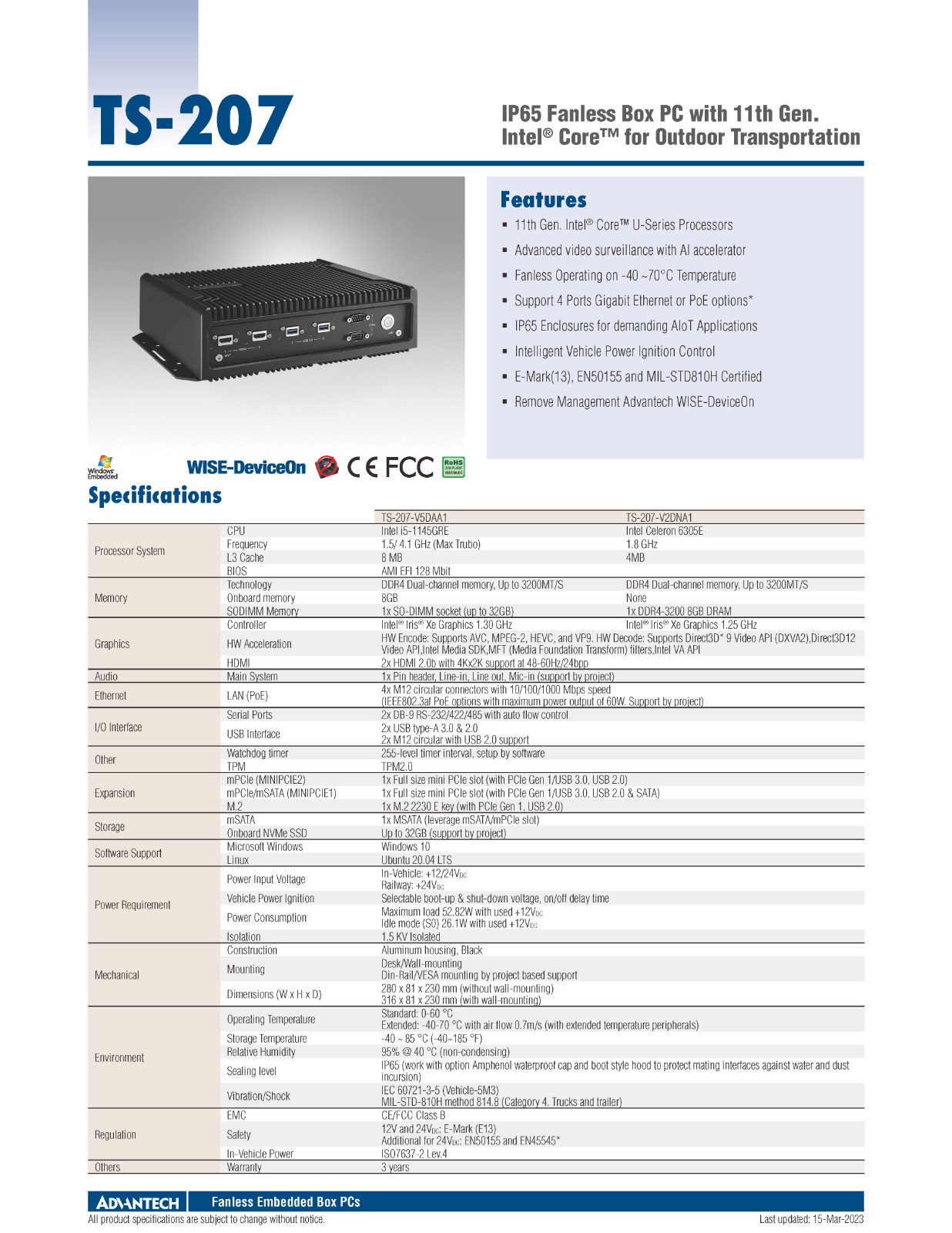 搭载第11代Intel Core U系列处理器SoC 无风扇设计,可在-40 ~70°C环境下工作 PoE GbE支持主流IP摄像头 可锁连接器与IP65防护等级 12/24 VDC with E-Mark & EN50155 certifications 智能车辆动力点火 内置研华DeviceOn软件,易于管理 无RED认证