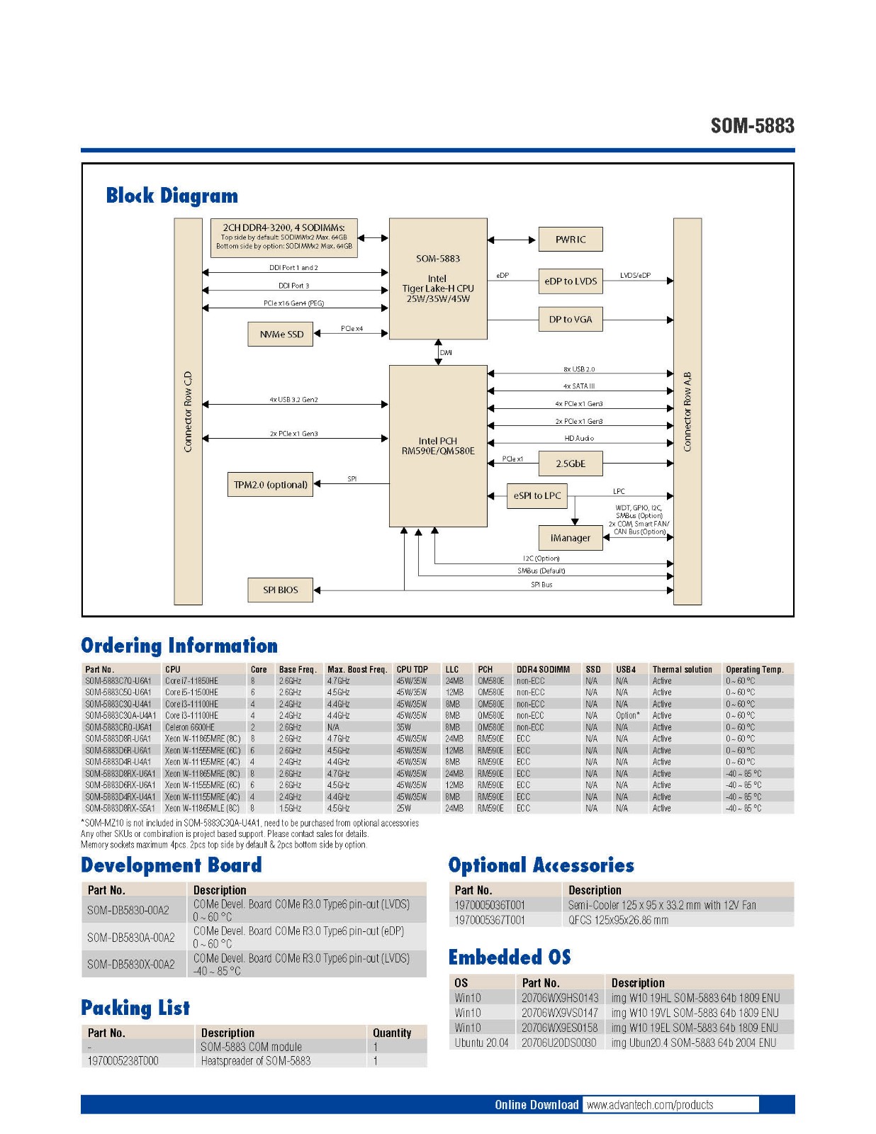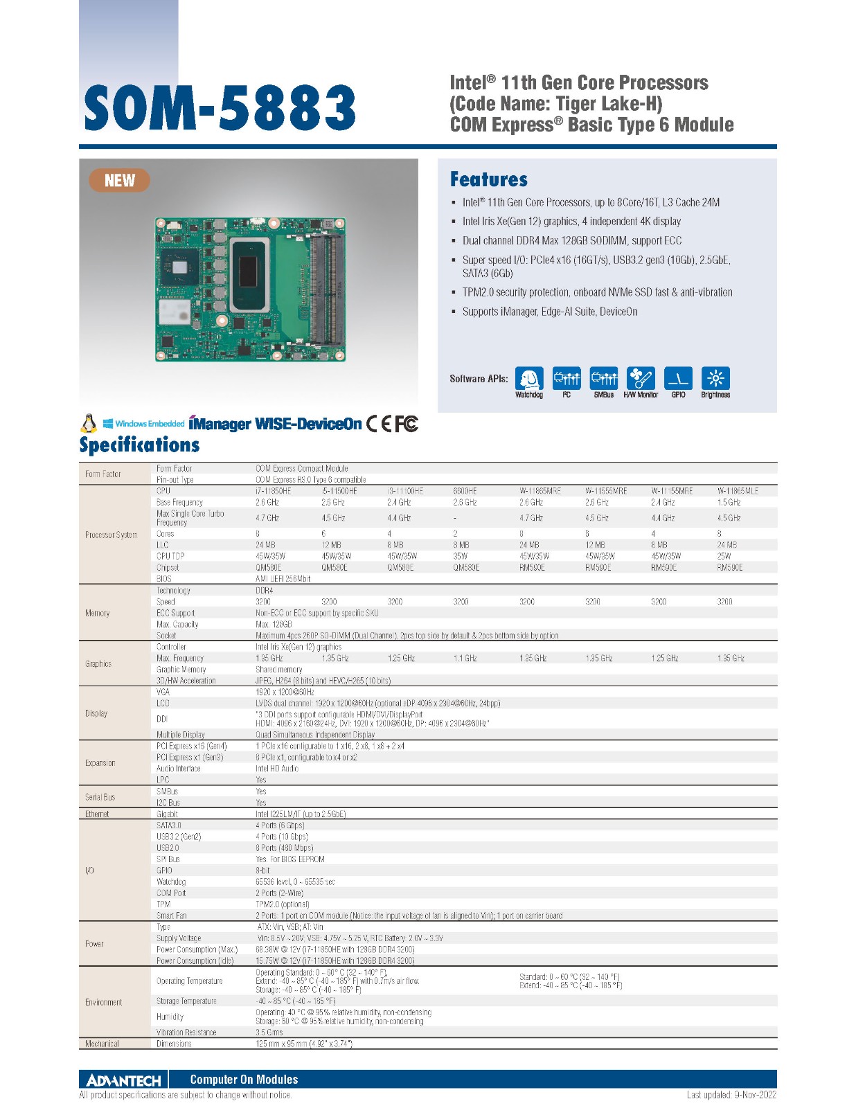 SOM-5883,搭载第11代Intel Core处理器,高达8核/16T CPU,支持 Intel Iris Xe(Gen 12)显卡,4个独立4K显示屏,高达128GB双通道内存,支持高速I/O扩展,是高端医疗,半导体测试设备等应用的理想解决方案。