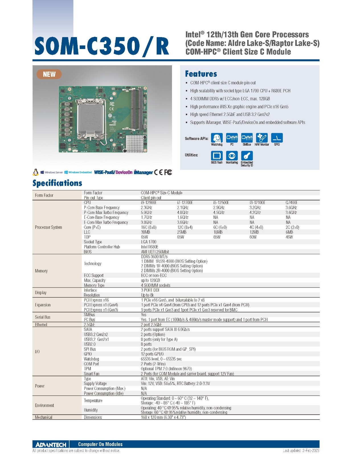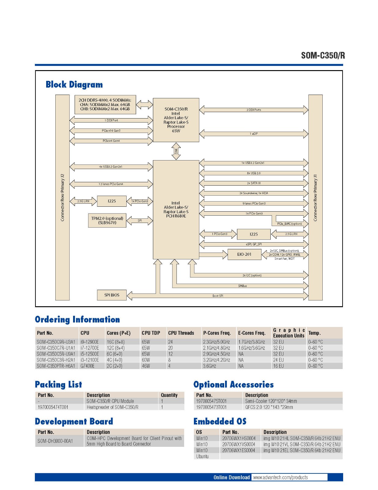 SOM-C350,高性能桌面级CPU,其BGA封装可灵活的更换处理器,搭载Intel第12代酷睿处理器(Alder Lake),性能对比上一代有很大的提升。该产品除了拥有出色的处理能力,还有出色的显卡性能,支持更快,更大内存容量,以及高速的I/O的扩展,如,DDR5,PCIE gen5,USB4,非常适合高端医疗,半导体测试设备和视频影像等应用领域。