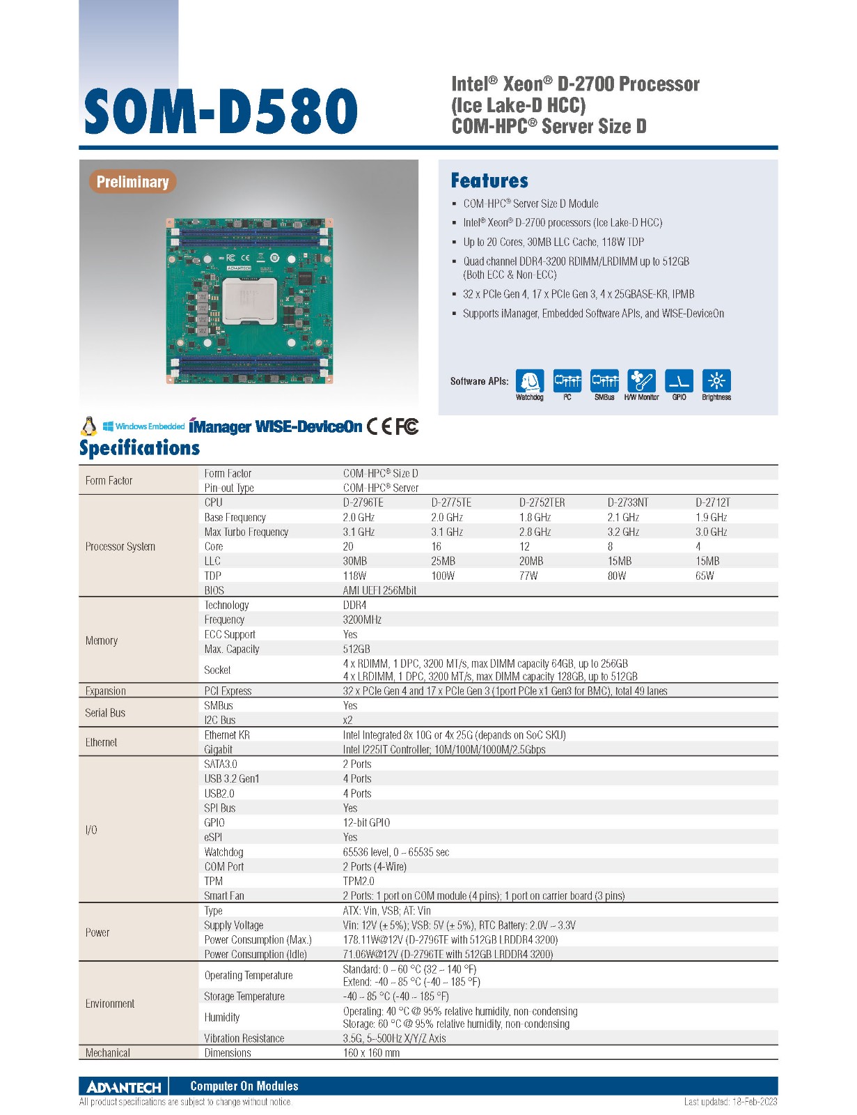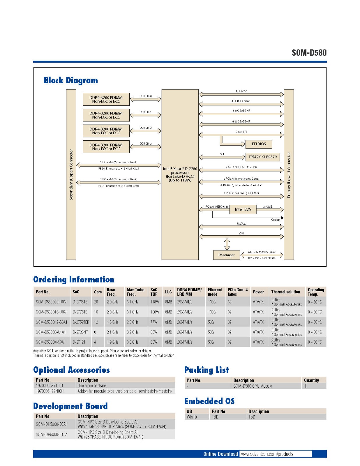 SOM-D580,搭载Intel下一代志强处理器Ice-lake D HCC,支持高达512GB内容和高速I/O接口,如49路PCIe4.0,4路25GbE网口;同时,研华还提供1U 薄型散热方案,可维持系统稳定运作。研华SOM-D580,可满足边缘计算海量数据处理能力,高速I/O扩展的核心要求,是边缘服务器、5G通信基站和DPI设备等应用的理想解决方案。
