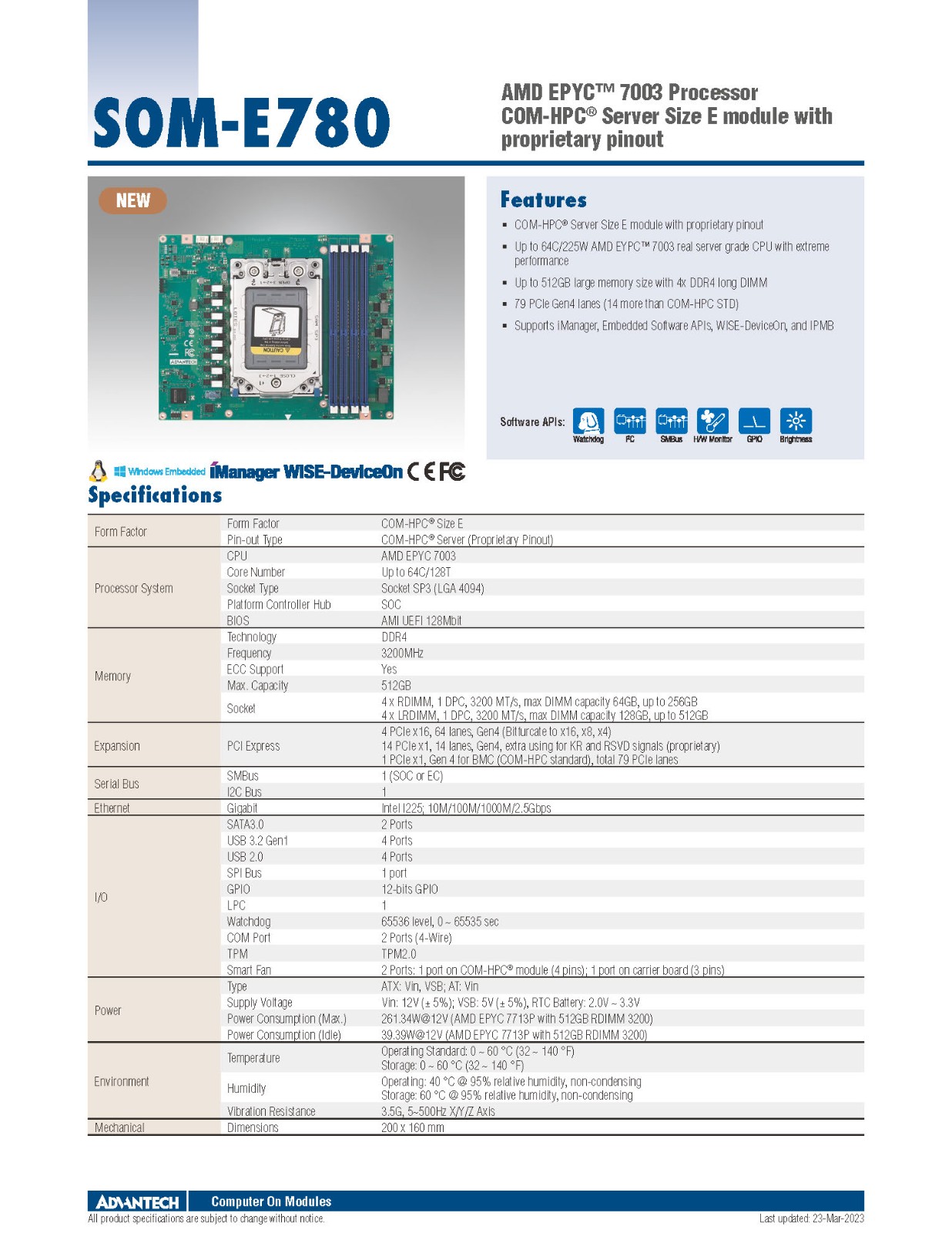 研华SOM-E780搭载高达64核/225W的AMD EYPC 7003系列处理器,512GB 大容量内存,79路 PCIe4.0扩展,比COM-HPC标准多了14路,支持 IPMB 远程控制,TPM安全保护,是为满足数据中心应用更高,更快吞吐能力的COM-HPC模块,助力CPU处理能力要求在20核以上的潜在应用,如高端医疗,半导体测试设备,汇聚分流设备等,协助客户缩短产品开发周期,加速产品上市。
