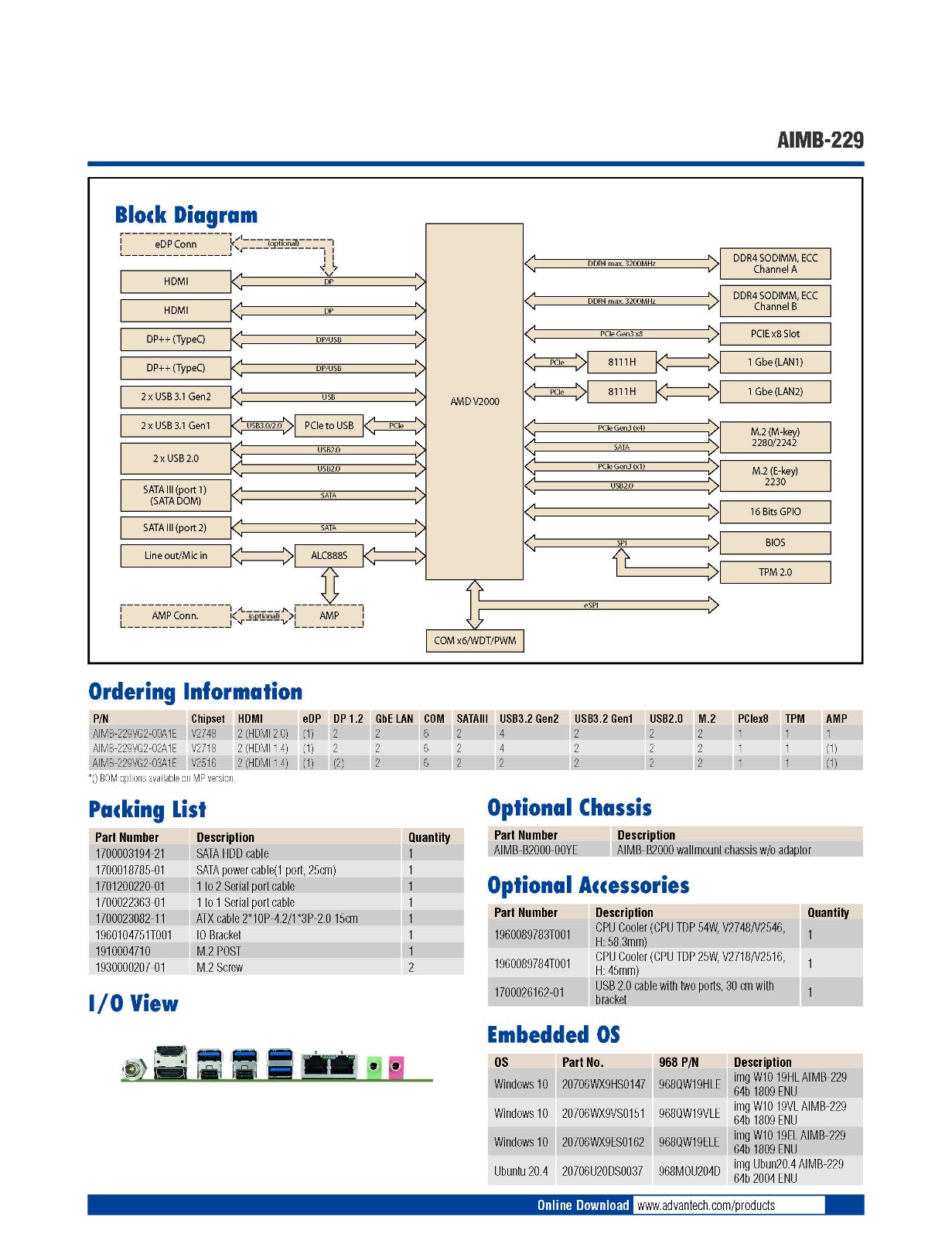 AIMB-229是一款Mini-ITX工业主板,板载AMD Ryzen嵌入式V2000系列处理器。外型紧凑(I/O高度为20mm),支持独立四显,采用嵌入式 AMD Radeon GPU, 具有图像运算出色性能。该产品将出色的计算性能与丰富的I/O支持以及WISE-DeviceOn软件相结合,从而为需要快速图像处理和沉浸式3D体验的医疗康复、游戏和数字标牌应用提供了理想的解决方案。