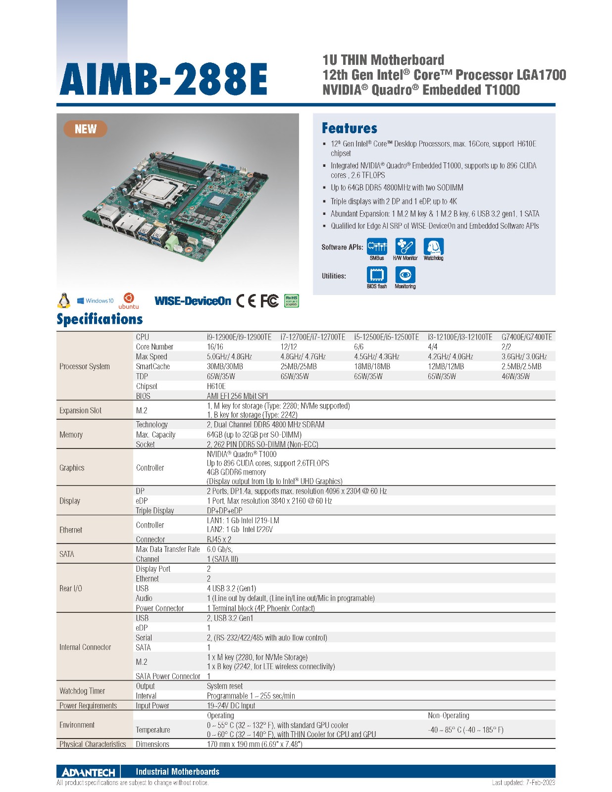 研华AIMB-288E是一款高性能、超薄Mini-ITX主板。尺寸为170mm x 190mm。预装Intel® 第12代 Core™ i CPU,搭载H610E芯片组。内置NVIDIA® Quadro®嵌入式级别T1000 MXM显卡,具有很强的图形处理能力。2个横向DDR5 SODIMM,最大支持到64GB。AIMB-288E支持独立三重显示。横向MXM显卡设计,整体高度不超过1U,拥有超薄散热设计,满足对空间的高度要求。广泛应用在机器视觉、医疗影像等领域。